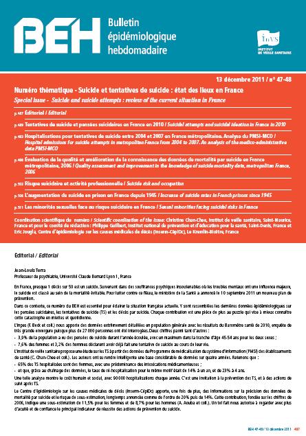 En Haute-Normandie, 366 décès par suicide (284 hommes et 82 femmes) ont été dénombrés en moyenne annuelle sur la période 2008-2010, ce qui situe la région au huitième rang des régions françaises présentant les plus fort taux de mortalité. Les tentatives de suicide3 ne sont pas toutes répertoriées par les systèmes de recueil de données. Ainsi, les tentatives vues en consultation de médecine générale ne sont pas dénombrées. Cependant, l’étude des données fournies auprès des établissements de soins dans le cadre du programme de médicalisation des systèmes d’information (PMSI)4 permet d’avoir une approche des séjours dont l’origine est une tentative de suicide. Ainsi, en 2011, 282 séjours sont dus chaque jour en France hexagonale à une tentative de suicide. À l’inverse des décès, le ratio hommes-femmes se fait au détriment de ces dernières puisqu’elles représentent 62 % de ces séjours hospitaliers. En Haute-Normandie cette même année, 14 séjours en moyenne journalière ayant pour origine cette même cause ont été dénombrés, dont 61 % concernaient des femmes.